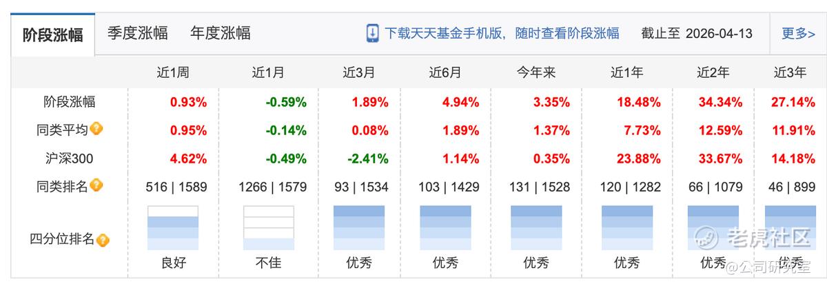 根据天天基金数据,截至4月13日,该基金今年以来净值增长3.35%,近1年涨幅18.48%,近3年上涨27.14%。
