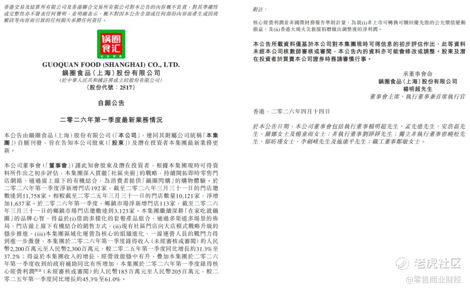 锅圈发布2026年一季报:核心经营利润增速最高达61%