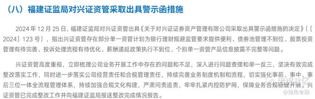 值得注意的是,2024年12月,兴证资管因为私募资管业务违规事件收到福建证监局的罚单,具体违规事项为:存在部分单一资管计划为银行理财规避监管要求提供便利、债券池管理不到位、股票投资管理有待完善、个别单一资管产品信息披露不完整等。