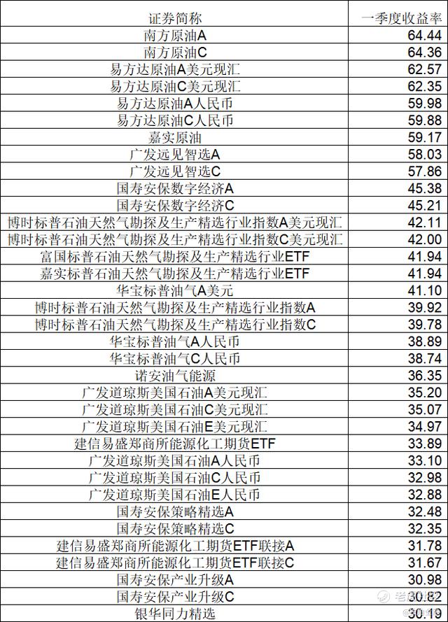 一季度收益率超过30%的公募产品数量总计35只,业绩榜单最引人注目的,无疑是原油主题QDII基金。南方原油A以64.44%的收益率位列全市场公募基金之首,易方达原油A美元现汇以62.57%紧随其后,嘉实原油以59.17%位列公募机构收益率第三。