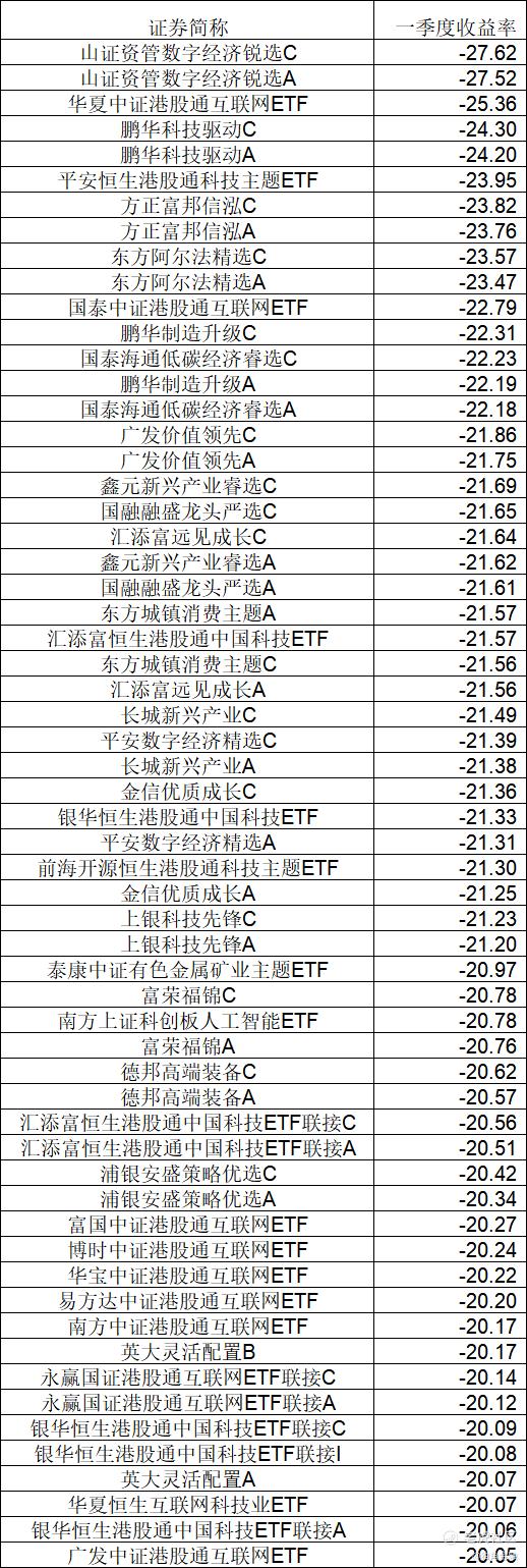 与榜单前排的高歌猛进形成鲜明对比,一季度收益率跌幅超过20%的产品数量总计60只。wind数据显示,山证资管数字经济锐选C以-27.62%的收益率成为全市场跌幅最大的基金,其A类份额跌幅亦达27.52%。