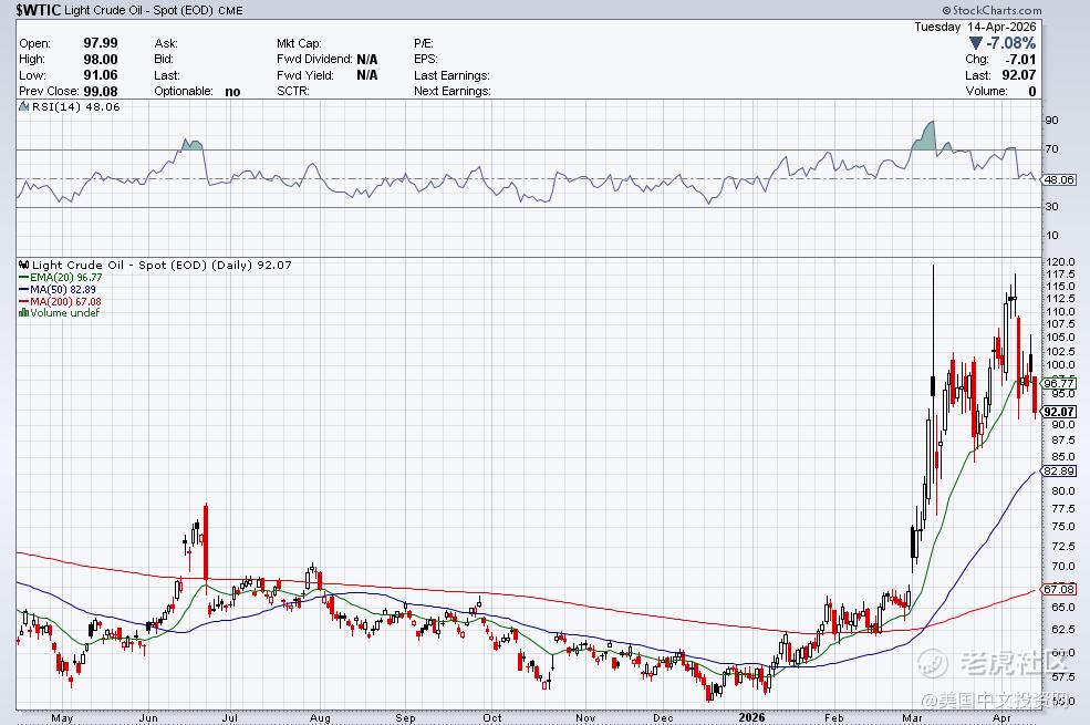 随着美伊停火预期升温、谈判窗口打开,油价从极端紧张中回落,周二应声下跌7%至92.07美元。