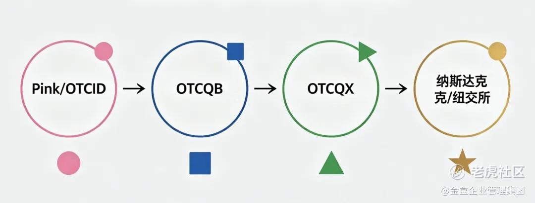 分层进阶路径成熟Pink/OTCID→OTCQB→OTCQX→纳斯达克 / 纽交所,四级清晰、逐级晋升,企业可按自身节奏完善合规、积累流动性、提升市值。