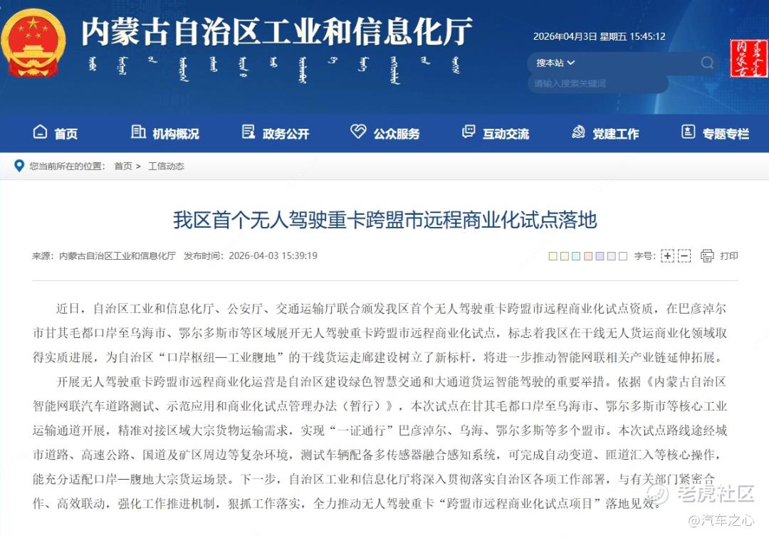 现在更进一步:以 Robotruck 为代表的 L4 级商用车,无人化运营开始突破更长距离、更大区域,内蒙古出现了首个无人驾驶重卡跨盟市远程商业化试点落地。