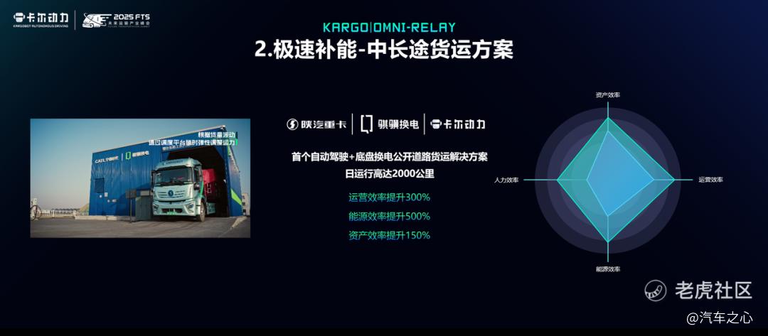 自动驾驶+底盘换电。接入宁德时代骐骥换电网络,凭借 5 分钟、513 度电的换电效率,理论每天可跑近 2000 公里,能够实现人停车不停的「全天候运力」。