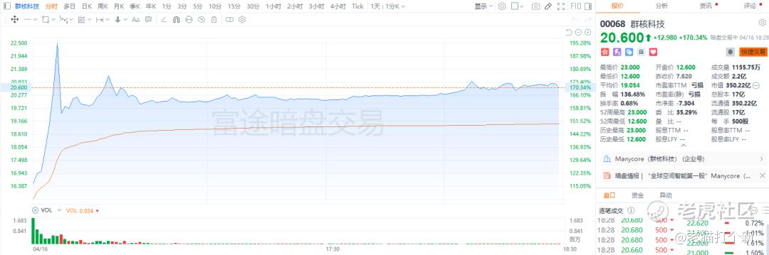 群核的暗盘走势是:开盘本身是翻倍110+%左右的水准,一路爆拉至200%,市值直接上400亿了,之后立马回落到160%附近,这是开盘8分钟的行情,后面基本上纯横盘震荡了。