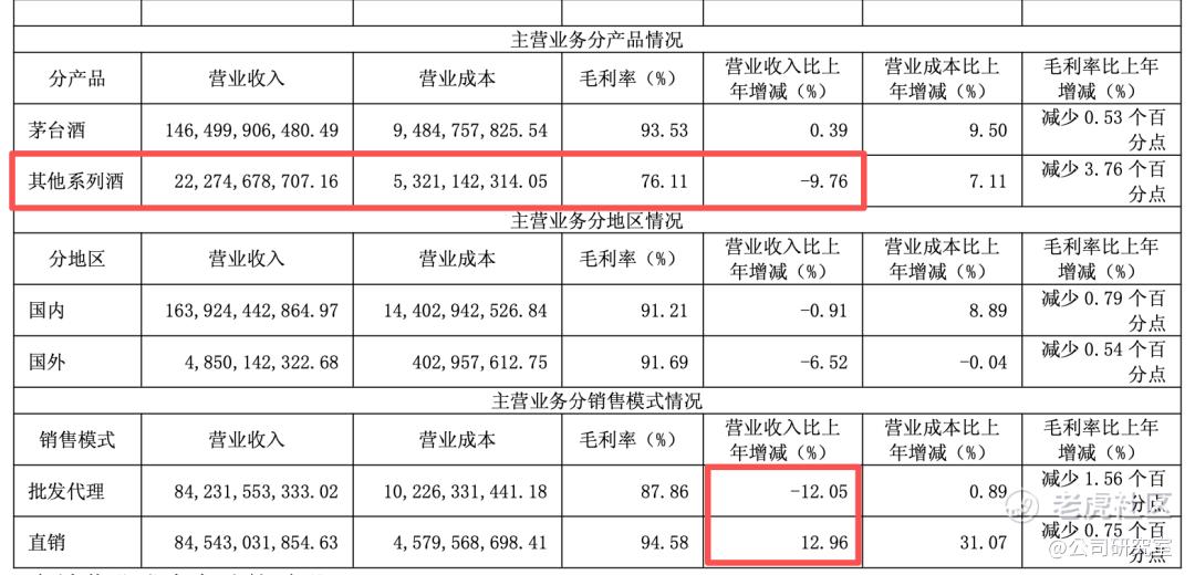 产品结构方面,茅台酒全年营收1465亿元,同比微增0.39%,毛利率93.53%;酱香系列酒营收222.75亿元,同比下滑9.76%,毛利率76.11%。公司表示,本次营收变动主要受酱香系列酒产品结构调整影响。
