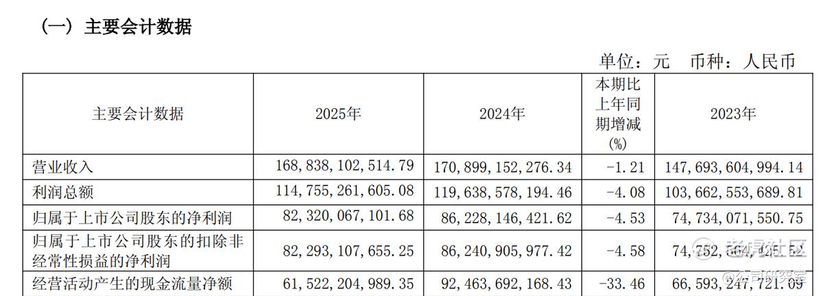 2025年,贵州茅台营收1688.38亿元,同比下降1.21%;归母净利润823.20亿元,同比下降4.53%;扣非净利润822.93亿元,同比下降4.58%;经营活动现金流净额615.22亿元,同比大幅下滑33.46%,核心盈利与现金流均承压。