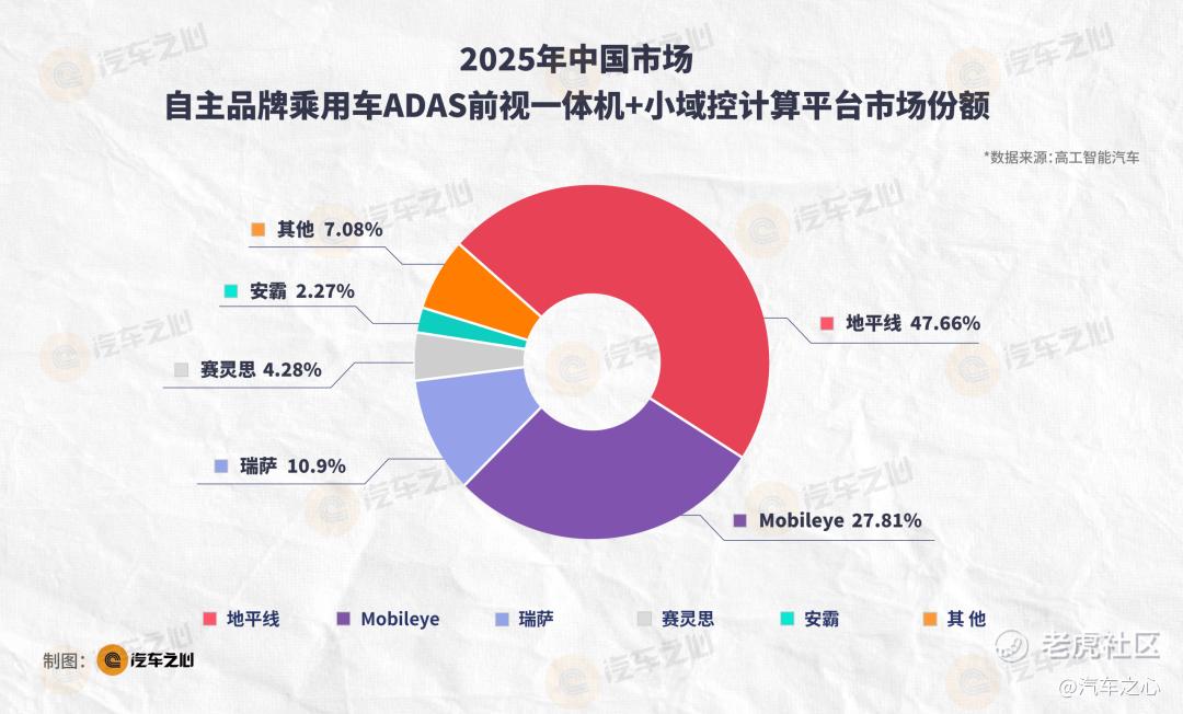 一个有关地平线。2025 年中阶市场 ADAS 前视一体机+域控芯片中,地平线以 47.66% 拿下市占率第一名。