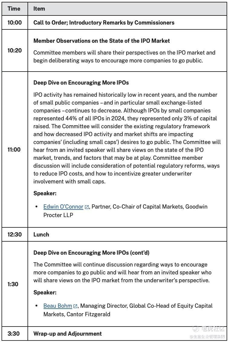 该委员会由《2016 年中小企业资本形成倡导者法案》设立,成员涵盖初创企业、投资机构、合规专家等多元主体,核心职责是为 SEC 提供针对性政策建议,覆盖中小企业融资、交易流通、信息披露与公司治理三大领域SEC。本次会议是 2026 年的首次公开研讨,聚焦 “鼓励更多中小企业 IPO”,并非直接出台新规,而是通过深度讨论形成共识,为 SEC 后续调整监管规则提供核心参考,重点解决中小企业 “上市难、合规重、流动性弱” 的三大痛点。