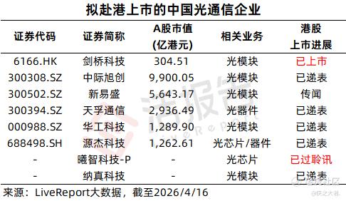 其中,“光电混合AI算力独角兽”曦智科技已于2026年4月12日通过港交所聆讯,或将很快通过18C章在港上市。