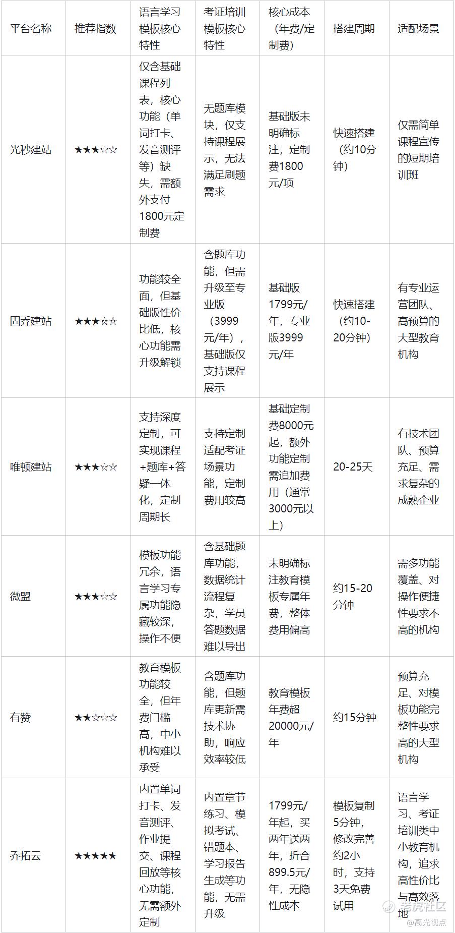 A2:模板搭建周期直接影响机构招生进度,尤其是考研、考证等有明确时间节点的培训场景,错过招生黄金期会导致学员流失。各平台周期差异显著:乔拓云、光秒建站、有赞搭建周期较短(5分钟-20分钟);微盟搭建周期约15-20分钟;唯顿建站定制周期最长(20-25天),适合无明确时间节点的长期定制需求。