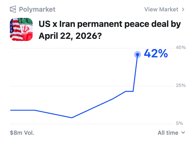 尽管声明仅称遵照停火协议而开放海峡,但预测市场显示,停火期结束时达成永久和平协议的可能性正在飙升。