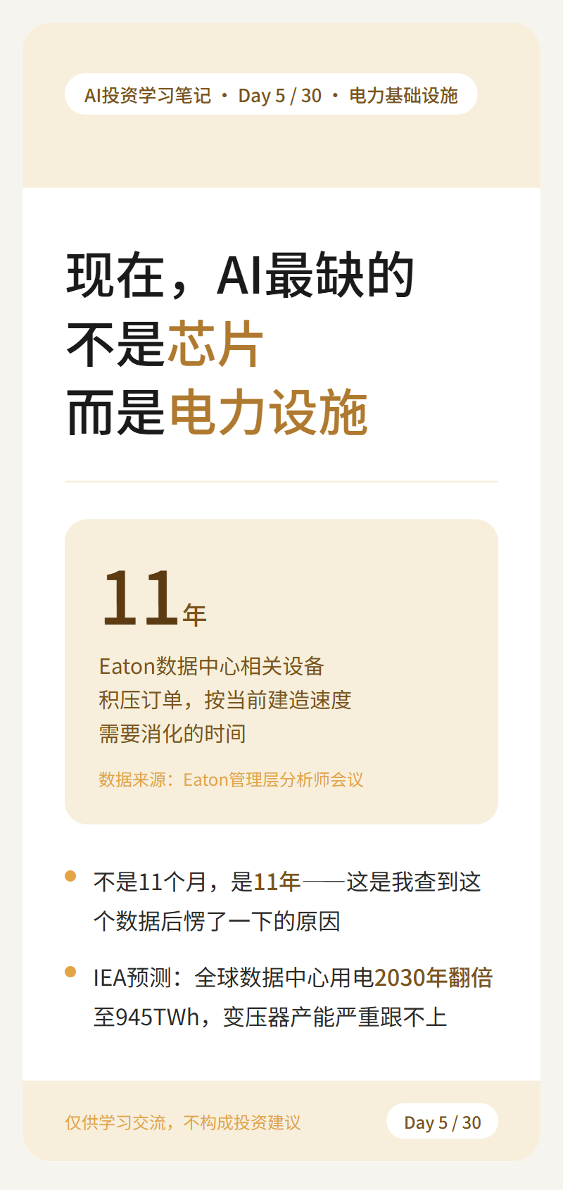 AI数据中心的用电量是普通办公楼的几十倍。IEA预测,全球数据中心用电2030年将翻倍至945TWh。问题是,电不是想要就有的——变压器、配电设备、电网接入,每一环都严重供不应求。