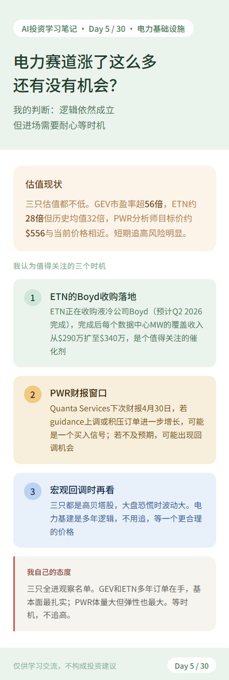 Quanta Services(PWR) 专业电气承包商,从发电厂到服务器机架的完整电气施工,2025年营收$285亿(同比+20%),积压订单$440亿。52周区间$251→$599。