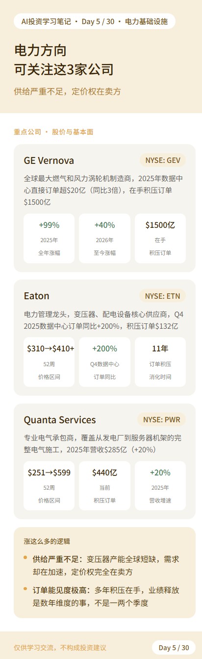 GE Vernova(GEV) 全球最大燃气和风力涡轮机制造商,2025年数据中心直接订单超$20亿(同比3倍),全年订单$593亿,在手积压订单$1500亿。2025年股价涨幅约+99%,2026年至今再涨约+40%。