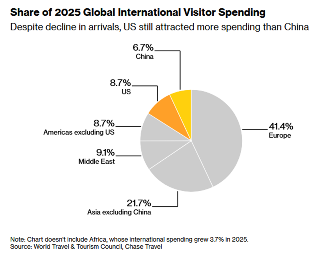2、根据世界旅游及旅行理事会的数据,2025年全球国际游客消费分布中,欧洲以41.4%的份额占据主导,其次是占比21.7%的亚洲(不含中国)。同期,美国因游客入境数量下滑,其消费份额降至8.7%,赴美游客支出下降近5%,导致美国旅游经济年增长率仅为0.9%。同期中国的外国游客支出则增长超过10%,推动其旅游经济整体增速达到9.9%,是全球平均水平的两倍以上。