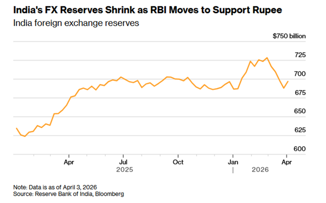 6、自2026年2月下旬伊朗战争爆发以来,印度外汇储备已减少超过300亿美元,其主要原因是印度储备银行(RBI)为遏制卢比过度波动而采取了干预措施。央行通过直接在市场抛售其持有的美元外汇储备,以支撑卢比的汇率稳定。同时,代表未来美元出售承诺的央行美元空头头寸在2月已攀升至770亿美元以上的11个月高位,限制了其进一步干预的能力。