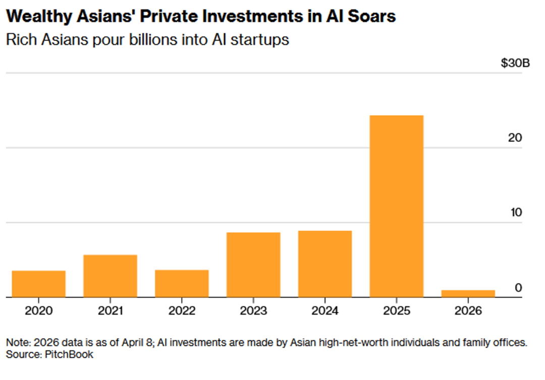 4、根据PitchBook的数据,亚洲高净值个人与家族办公室对全球人工智能初创公司的私人投资额在2025年升至243亿美元,相较于2023年和2024年均不足80亿美元的水平,实现了近三倍的增长。