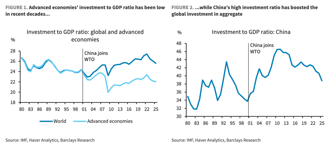 3、过去二十年,全球投资占GDP比重从23%升至27%的增长趋势,掩盖了发达经济体的结构性疲软。这一增长几乎完全由中国驱动:中国在2001年加入世贸组织后,投资率从2002年的36%飙升至2011年47%的峰值;即便在近期因房地产低迷回调至38%,仍以其巨大体量独立拉高了全球总额。相比之下,发达经济体的投资率则呈现长期下行趋势,从本世纪初24%至26%的区间,逐步降至22%左右。