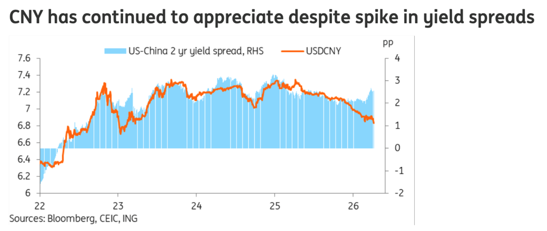 4、尽管近期中美两年期国债利差因美国收益率上升而扩大至2025年2月以来的最高水平,但人民币汇率并未因此出现显著走软,仅温和调整后便延续了升值趋势。这一现象打破了过去利差扩大通常会削弱人民币的模式,其背后是市场已在消化地缘冲突将得到控制,以及美联储后续将重回降息通道的预期。这种对未来利差收窄的提前定价,使得人民币得以摆脱短期利差扩大的负面影响,汇率走势更多由强劲的宏观基本面和结汇需求主导。