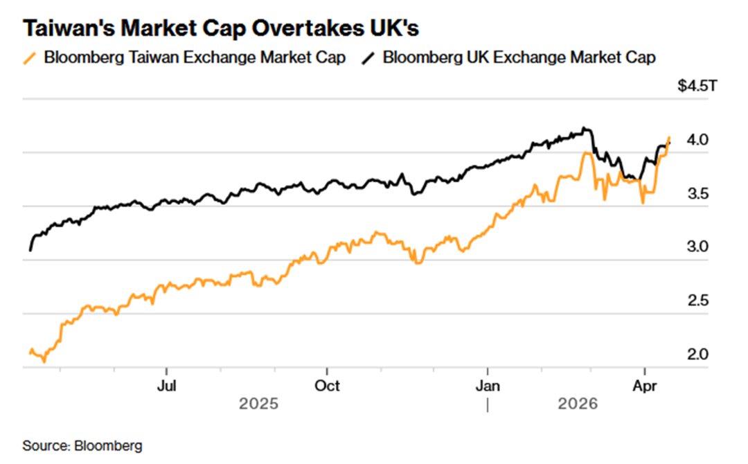 15、在人工智能相关产业需求的推动下,台湾股市总市值于2026年4月升至4.14万亿美元,超越了英国的4.09万亿美元,位列全球第七。4月分外资投资者净买入台湾股票达89亿美元,促使台股指数当月上涨16%。相较之下,英国富时100指数同期涨幅不足4%。