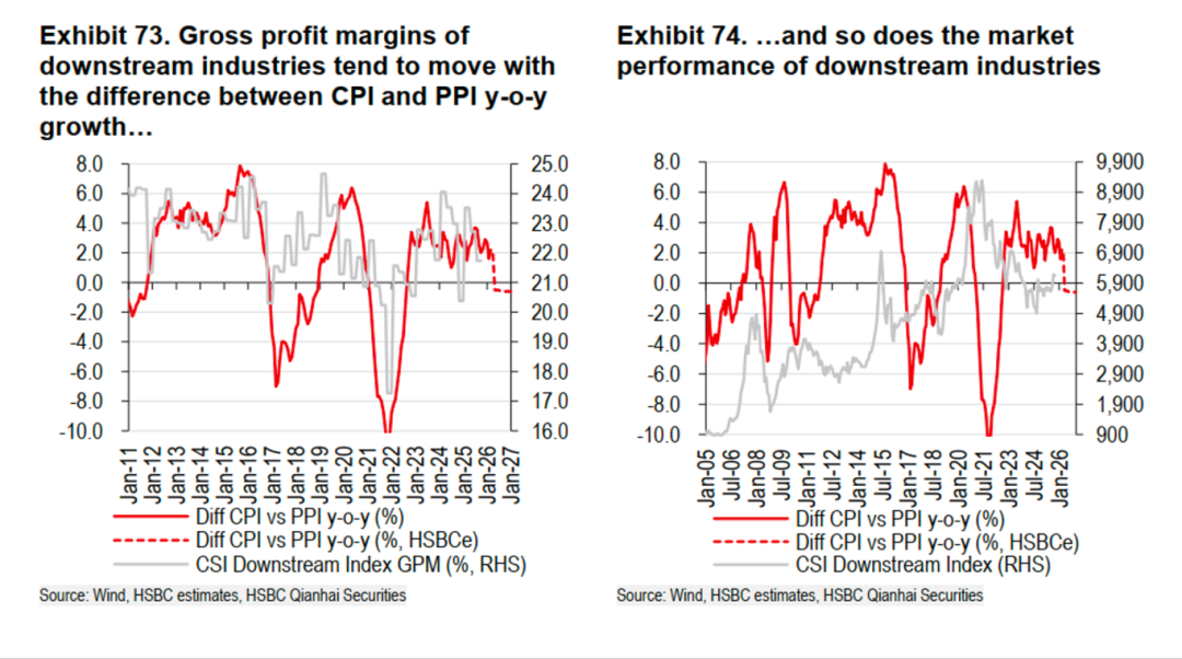 14、下游消费行业的盈利能力及其在二级市场的表现,与居民消费价格指数(CPI)和工业生产者出厂价格指数(PPI)之间的增速差呈现高度相关性。当CPI同比增速超过PPI时,意味着下游企业的产品售价涨幅高于其原材料成本涨幅,从而带来毛利率的扩张。这种利润空间的改善通常会传导至股价,使得下游行业指数在CPI–PPI剪刀差扩大的宏观环境下表现更优,因为投资者会提前定价这一盈利改善的预期。