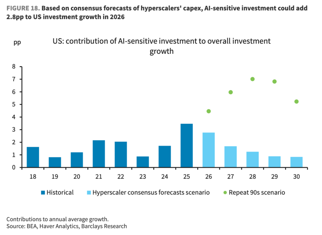 5、基于对大型云服务商(Hyperscalers)资本支出共识的推演,当前由人工智能驱动的投资潮对美国整体经济的提振效应预计是前置且短暂的。模型显示,AI相关投资对总投资增长的贡献将在2025年达到3.5个百分点的阶段性高点,随后在2026年降至2.8个百分点,至2027年便会回落至1.7个百分点的历史平均水平。此趋势表明,在基准情景下,这轮AI投资更接近于一次性的短期脉冲,其峰值贡献尚不足以单独支撑一轮典型的、增长率可达6–7%的长期资本支出上行周期。