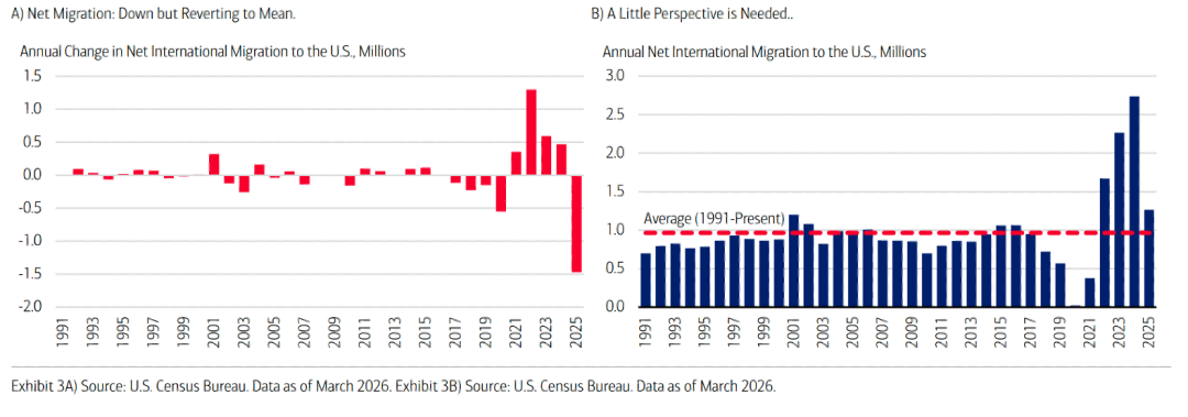 9、尽管2025年美国净国际移民人数从前一年的270万骤降至130万,同比降幅达54%,但这并非趋势性恶化。数据显示,2022至2024年的移民流入是受短期宽松政策影响的异常高值,2025年的130万净增量仍显著高于自1991年以来约96.4万的年度平均水平。