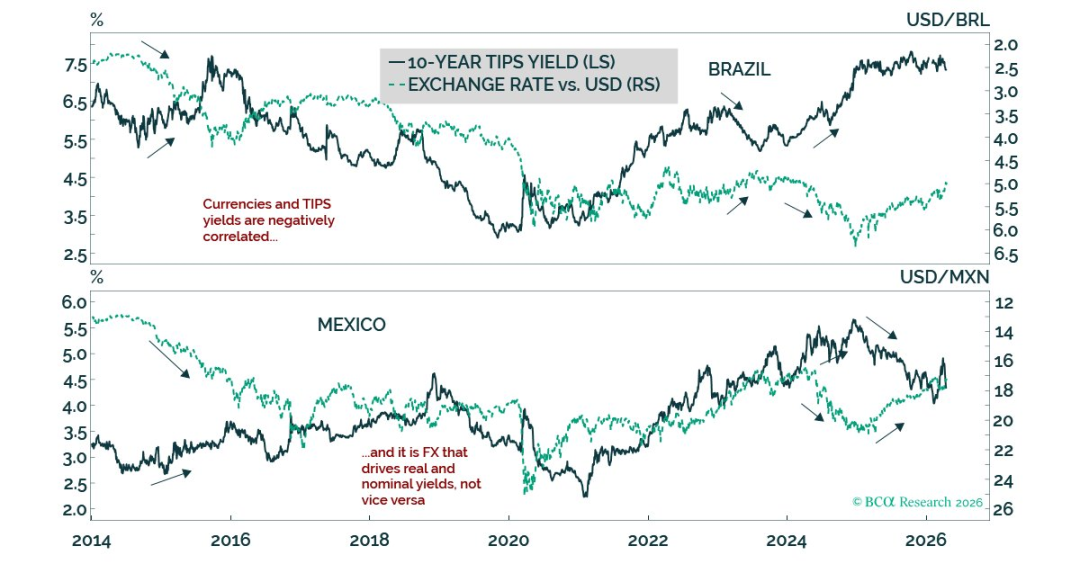 10、BCA:通常,高实际利率被视为对巴西雷亚尔、墨西哥比索或南非兰特等高收益新兴市场货币的利好信号。然而,这一观点是错误的。在高收益新兴市场,往往是汇率驱动了实际利率(甚至名义利率),而非利率驱动汇率。图表显示,在巴西和墨西哥,实际利率(10年期经通胀调整后的利率)常常与本币汇率呈负相关:当本币贬值时,实际利率上升;当本币升值时,实际利率下降。简言之,在这些市场中,要想在固定收益投资上获利,关键在于准确判断汇率走势。