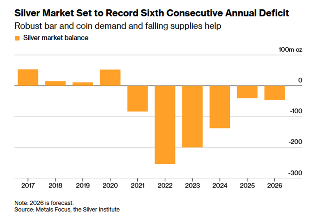2、根据世界白银协会的年度展望,全球白银市场预计在2026年将连续第六年出现供应短缺,赤字预计扩大15%至4630万盎司。供应端方面,预计因矿业产出轻微下滑及生产商套期保值活动减少而下降2%,尽管7%的回收量增长可部分抵消该损失。需求端方面,尽管银条与银币的投资需求预计增长18%,但由于工业应用、摄影、珠宝和银器领域的消费下降,总消费量预计仍将下滑2%。该机构认为,经济增长放缓和政府财政压力可能压低经通胀调整后的债券收益率,从而提振白银等无息贵金属的避险需求。