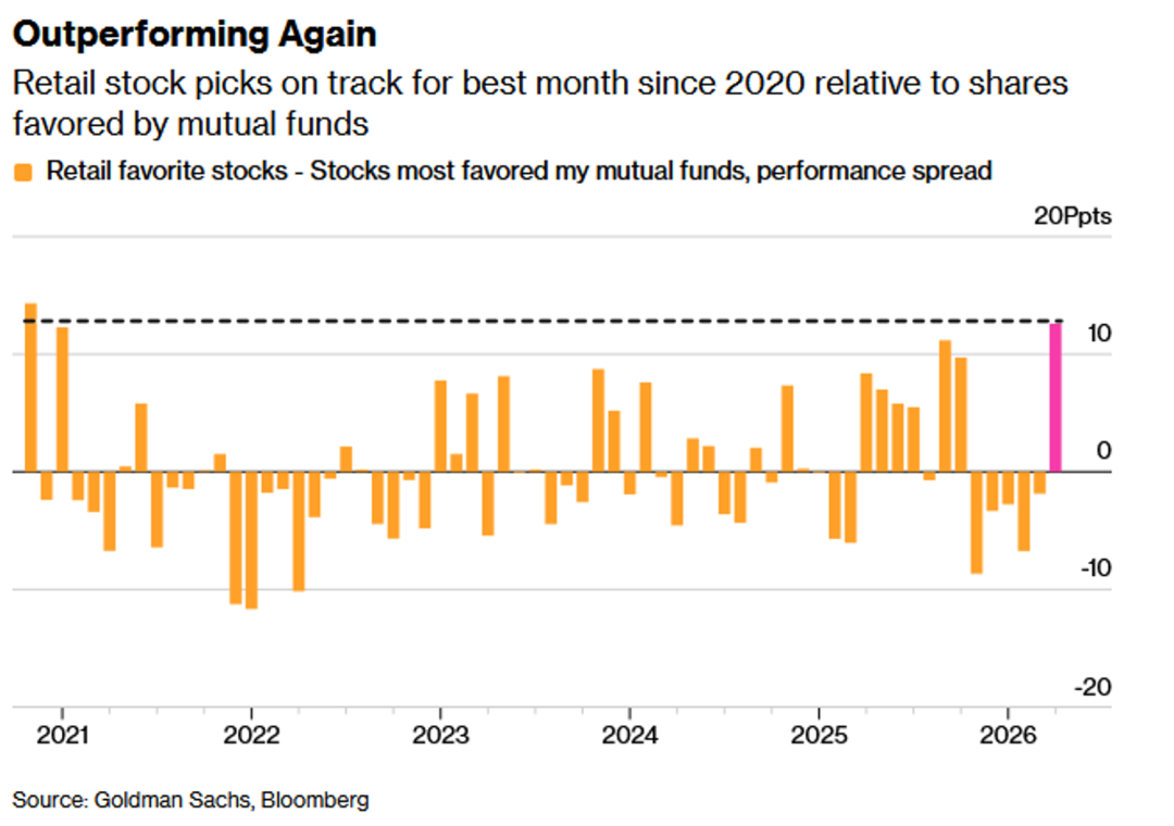 16、但是,散户投资者偏好的股票组合相对于共同基金重仓股的表现,正创下自2020年11月以来的最佳单月记录,超额收益已超过10个百分点。