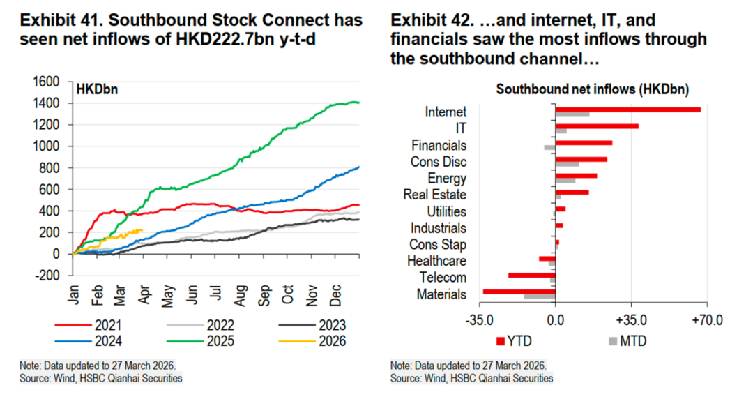 20、南向资金作为香港市场的重要流动性来源,其配置偏好清晰地指向了特定行业。截至2026年3月,年内南向资金净流入已超过2200亿港元;从行业分布看,资金高度集中于互联网、信息技术和金融板块,这三者合计吸纳了超过80%的净流入资金。这种集中配置反映了内地投资者对香港市场独特资产的战略性布局,即获取A股市场稀缺的头部科技公司标的,并配置具备高股息和低估值特征的金融股。