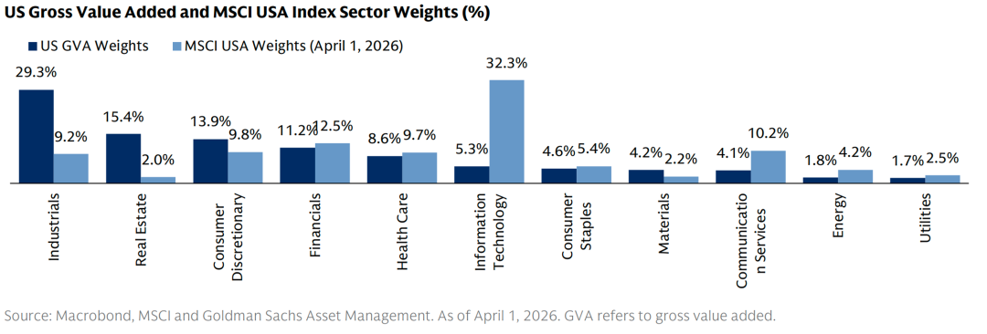 6、美国实体经济的部门构成与MSCI美国指数的权重之间存在显著错位,揭示了公共市场在代表实体经济方面的局限性。工业与原材料等支撑实体经济和基础设施建设的部门,占美国总增加值(GVA)超过33%,但在股指中的权重仅约11%。相反,信息技术行业在指数中的权重远超其对GVA的贡献。这种结构性差异意味着,寻求投资于实体经济建设和资源超级周期的投资者,需通过私募市场等另类资产来弥补公开市场在相关领域敞口的不足。