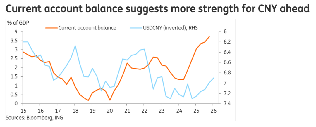 2、自2024年起,中国经常项目顺差占GDP的比重持续走高,为人民币提供了稳固的基本面支持,但汇率升值幅度并未与顺差增长完全同步,两者之间形成明显缺口。这种背离的主要原因是,在海外收益率更具吸引力及国内投资需求偏弱的背景下,大量出口企业选择将外汇收入留存于海外账户。这部分未结汇的资金形成了人民币的巨大潜在需求池,一旦未来利差收窄或国内经济信心回暖,积压的结汇盘将集中释放,为人民币提供上涨动能。