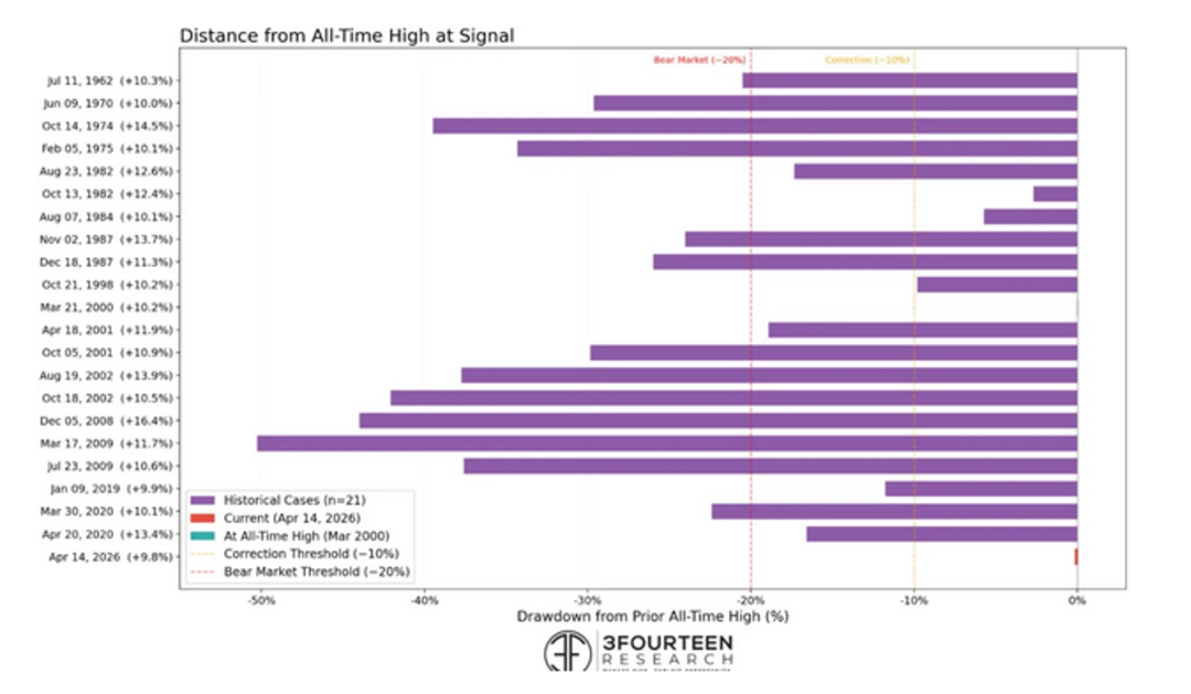 13、自2026年3月30日以来,标普500指数在短时间内实现了超过10%的涨幅,这是1950年以来第21次出现如此迅速的反弹。然而,过去20次类似规模的快速上涨,绝大多数都发生在市场从前期高点大幅回撤20%至50%的区间内。本次反弹启动时,市场距离历史高点不足10%,这一模式极为罕见,仅与2000年3月互联网泡沫破裂前夕的市场状况相似。