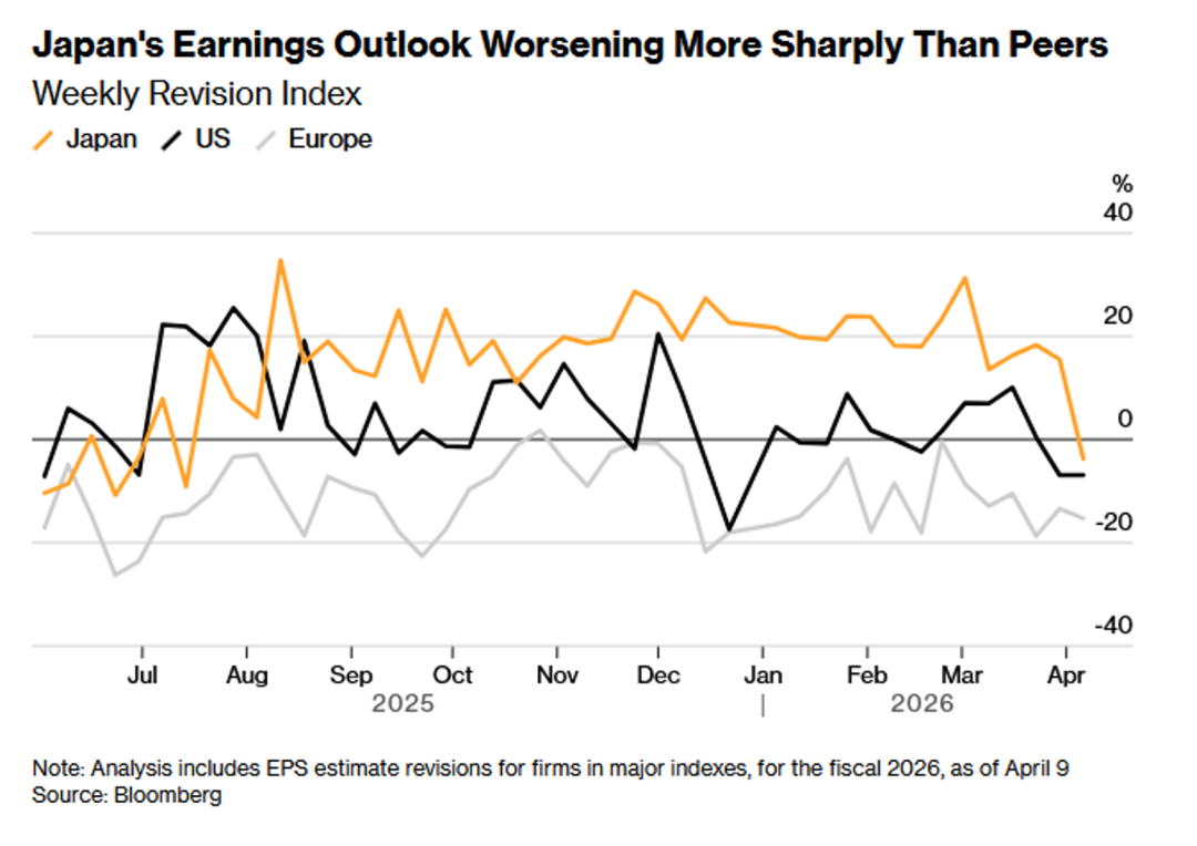 2、受油价持续维持高位影响,分析师上周对东证500指数成分股中的113家公司进行了盈利预测下调,特别是化工和零售等对石油高度依赖的行业。这导致日本企业的盈利修正指数自2025年7月以来首次跌破零值水平。