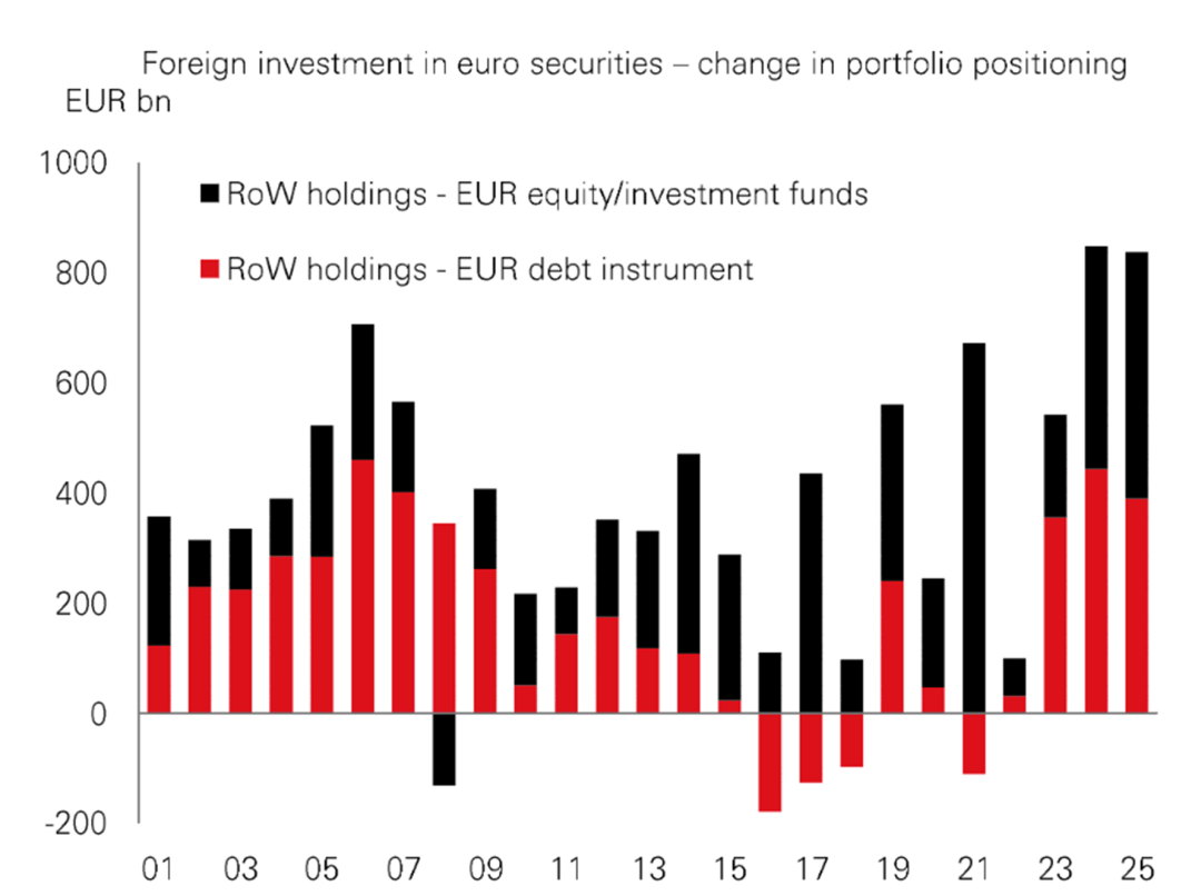 4、过去三年的数据显示,跨境资金对欧洲股票与债券的配置均在加强。这一趋势由对美国政策不确定性的规避情绪,以及欧美增长差异收窄和欧元区积极财政政策共同驱动。