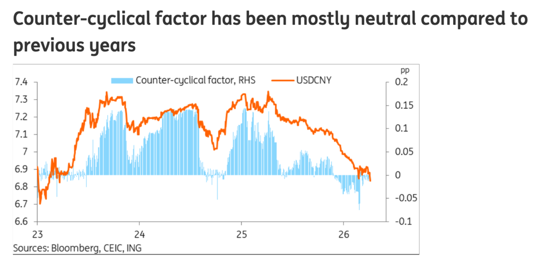 3、进入2026年4月初,中国央行在人民币中间价定价中使用的逆周期因子已基本回归中性,这标志着监管层对当前人民币的升值趋势持开放态度。此举与早前通过该因子抑制升值的操作形成对比,其政策转向主要归因于中东冲突引发的通胀压力。作为全球最大的原油进口国,容忍人民币走强有助于缓解部分进口成本。此外,战争带来的不确定性可能导致中国央行推迟降息计划,这种货币政策上的滞后也为人民币汇率提供了支撑。