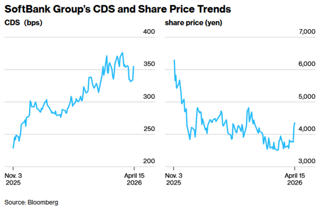 3、自2025年11月起,软银集团信用违约互换(CDS)利差从约225个基点持续扩大至超过350个基点,同期股价则从6000日元上方一路下跌至4000日元附近。这一趋势的背后是公司为支持其AI战略而大幅增加的债务负担,包括为增持OpenAI股份而进行的300亿美元融资。融资成本的飙升体现在近期发行的36亿美元垃圾债券中,其中十年期美元债的票息达到了创纪录的8.5%。由于担忧其AI投资可能损害公司流动性与资产信用质量,标普全球评级已将其评级展望从稳定下调至负面。