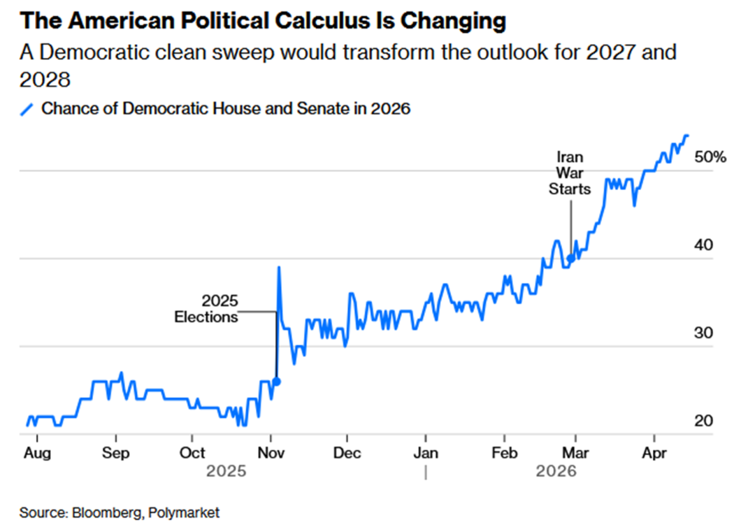 1、预测市场走得更远,Polymarket的数据显示,市场押注民主党在2026年中期选举中同时控制参众两院的概率,已突破50%。