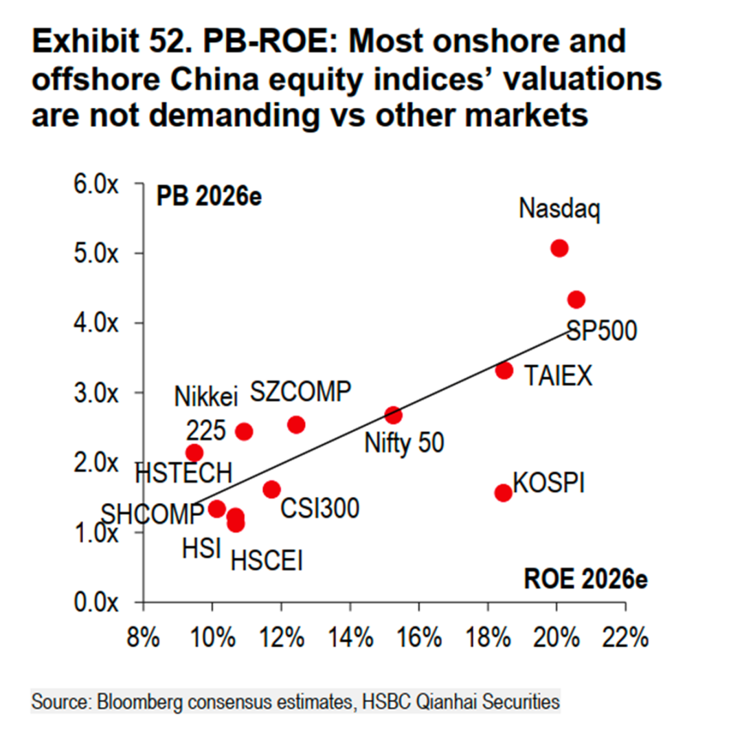 18、基于市净率与净资产收益率(PB–ROE)的框架分析,中国主要股指的估值水平同样未充分反映其盈利能力。尽管沪深300指数和恒生指数的预期净资产收益率(ROE)均维持在10%至12%的稳健区间,其市净率(PB)却仅在1.0倍至1.5倍之间徘徊。这一水平显著低于全球可比市场中同等ROE水平所对应的估值。