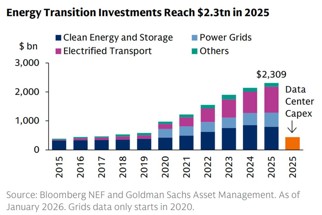 5、全球能源转型投资规模在2025年已增至2.3万亿美元,主要由电气化交通、清洁能源及储能领域的支出驱动,其体量已是同年全球数据中心资本支出的五倍以上。投资的快速增长不仅限于可再生能源发电,还包括为适应新需求而进行的电网现代化改造。这一持续且大规模的资本部署,确立了能源转型作为未来十年关键的结构性投资主题,为相关基础设施建设创造了长期且庞大的融资需求。