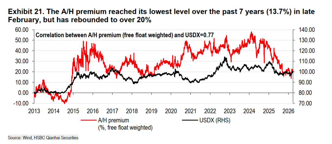 19、A股相对H股的溢价水平与美元指数呈现出0.77的强正相关性,反映了全球流动性对两地市场估值差异的显著影响。当美元走强时,往往伴随着资金从香港市场等新兴市场流出,导致H股价格承压,从而推高A股的相对估值,使得A/H溢价扩大。