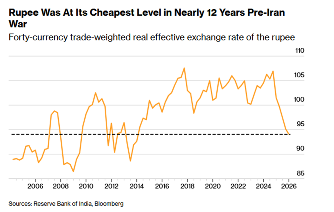 5、在伊朗战争引发能源价格冲击之前,印度卢比的四十大贸易加权真实有效汇率(REER)就已跌至近12年来的最低水平。这种长期的贬值趋势源于结构性经济问题,特别是国内频繁飙升的通货膨胀削弱了卢比的购买力。通胀问题由天气因素导致的食品价格波动、效率低下的供应链以及对进口能源的高度依赖共同驱动;后者使印度经济极易受到全球供应中断和输入性通胀的冲击。