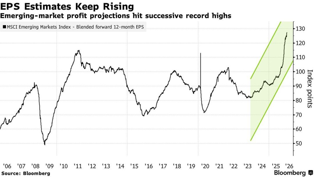 3、得益于亚洲人工智能产业链的强劲盈利预期,MSCI新兴市场指数的12个月远期每股收益(EPS)预测正持续创下历史新高,指数点位已从2023年初的约85点攀升至超过120点。分析师已将该指数成分公司的盈利预测上调23%,为2009年经济复苏期以来的最快增速,并预计未来一年EPS增长率将接近50%。此轮增长的核心动力,源于美国科技公司在AI领域的巨额资本开支,直接拉动了三星电子、台积电等亚洲硬件制造商的芯片需求,使其盈利预测获得大幅上修,从而抵消了地缘政治冲突对全球市场的初步冲击。