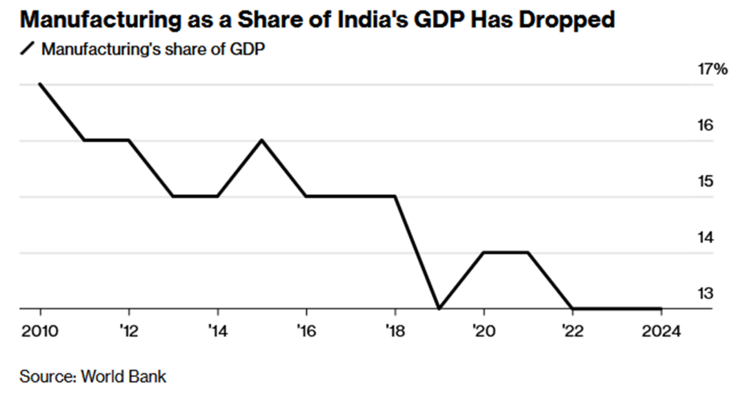 7、印度制造业占GDP的比重已从2010年的17%萎缩至2024年的13%,与政府设定的25%目标差距拉大。尽管印度推行了多项改革,但在充满挑战的全球贸易和地缘政治环境下,其制造业发展受阻,仅能在制造业价值链的低端领域寻求机会。