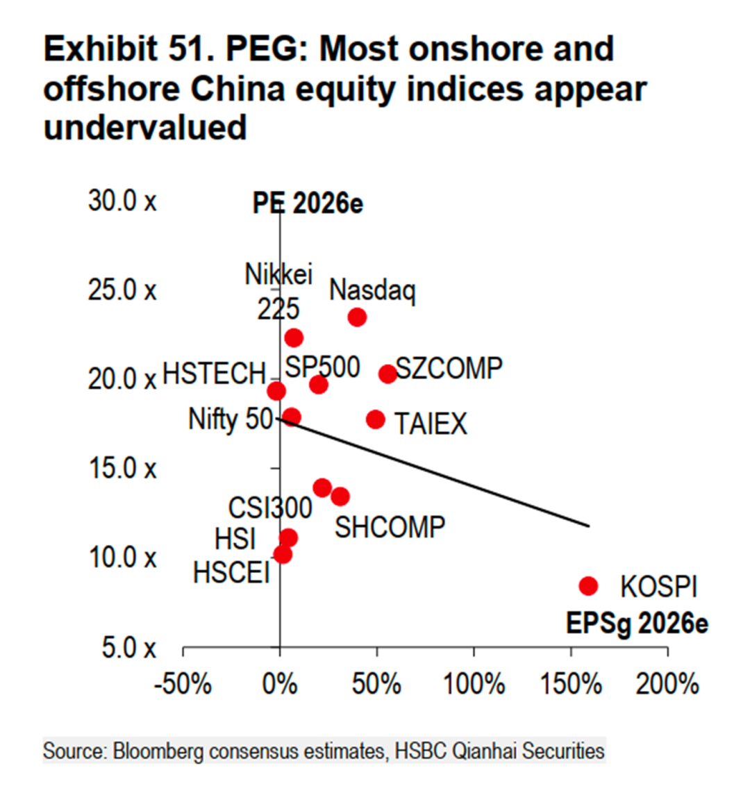 17、从市盈率相对盈利增长(PEG)的视角评估,A股与港股主要指数相较于全球其他市场,呈现出显著的估值优势。根据对2026年市盈率和每股收益增长率的预测,沪深300、上证综指以及恒生指数均位于低市盈率与正向盈利增长的区间,其PEG指标远低于美股和日经等发达市场指数。