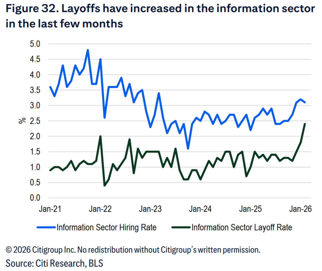 8、美国劳工统计局数据显示,与人工智能技术应用高度相关的通信行业,其裁员率自2025年中期开始显著攀升,至2026年1月已达到约2.5%。尽管这一趋势被视为AI影响就业的潜在证据,但同期招聘率的微幅回升,显示其更可能反映的是行业内部的人员流动加剧。另外,企业也可能为降低在AI领域的高昂投资成本压力,有意选择削减劳动力开支;这种“裁员与AI技术提升生产力从而直接替代人工”的逻辑存在本质区别。