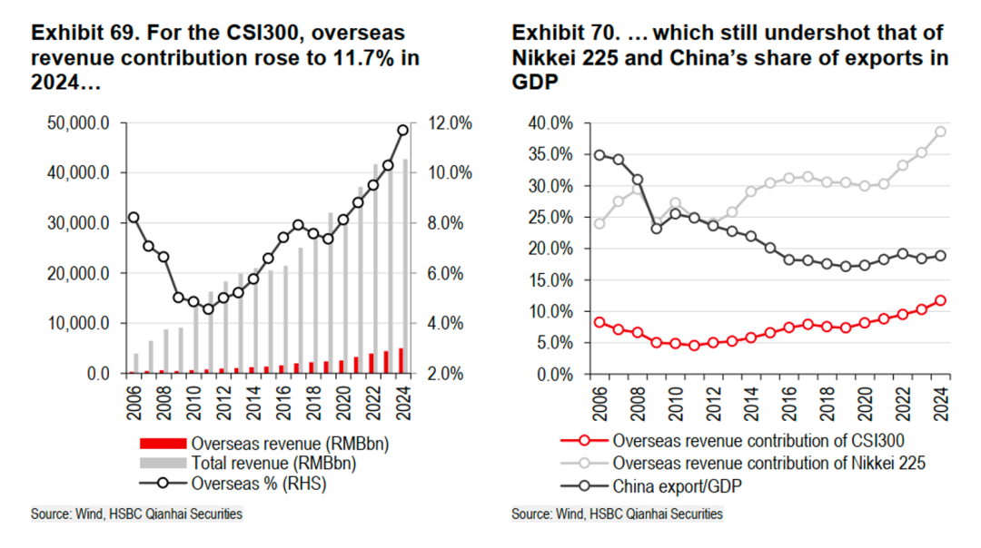 11、沪深300成分股的海外业务收入占比虽在2024年提升至11.7%,但其国际化程度与全球主要市场及中国自身出口规模相比仍有较大差距。相比之下,日本日经225指数成分股的海外收入贡献度接近40%,而中国出口占GDP的比重也达到约18%。这意味着,中国龙头企业的全球市场渗透率和收入来源多元化水平尚有广阔的提升空间,其市值增长的潜力并未完全释放,未来通过出海战略深化全球布局将是关键的增长驱动力。